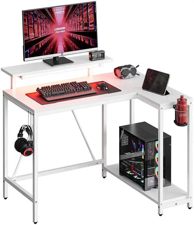 42" Reversible L-Shaped Gaming Desk with Monitor Stand, LED Lights& Headset Hooks, Home Office, Carbon Fiber White
