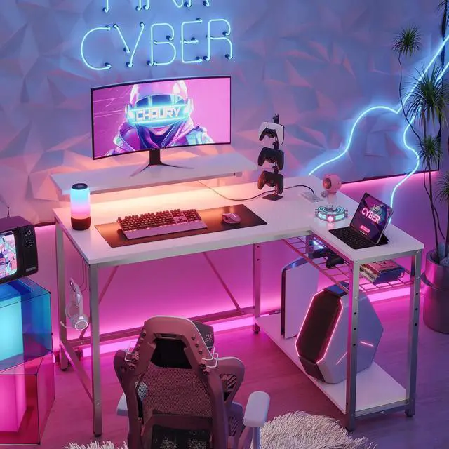 42" L Shaped Computer Desk with Power Outlets, Home Office Desk with LED Lights & Monitor Stand, Reversible Shelves, Corner Desk for Small Spaces ,Bedrooms