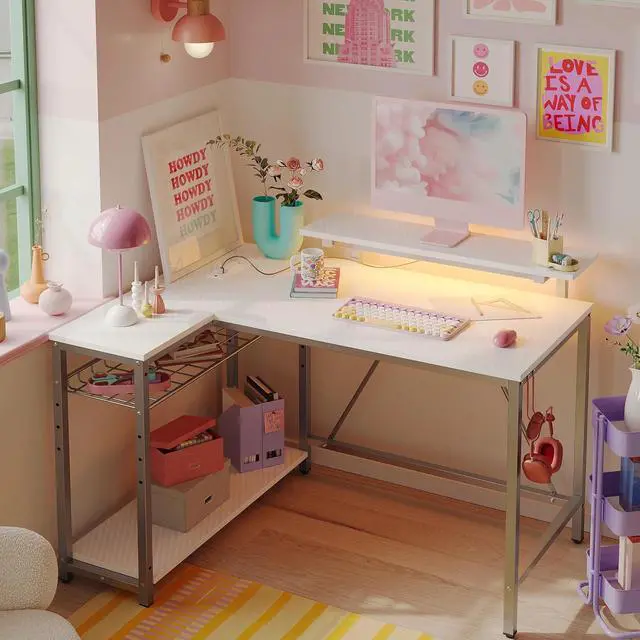 Space-Saving Design: The L-shaped corner desk maximizes limited space with a double-layer storage rack and an adjustable metal mesh panel for flexible item placement.