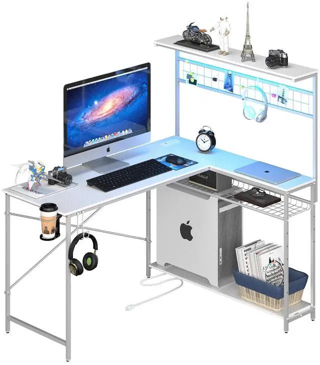 Bestier 51 L Shaped Gaming Desk with Power Outlets, LED Workstation with 4 Tiers Shelves for Home Office, Gamer Reversible Table with Hooks and Cup Holder Carbon Fiber White