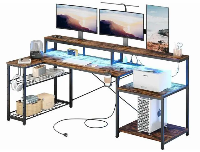 Bestier 71 inch L-Shaped Gaming Desk with Power Outlets LED Computer Office Table with Monitor Stand & Storage Shelf in Carbon Fiber Rustic Brown