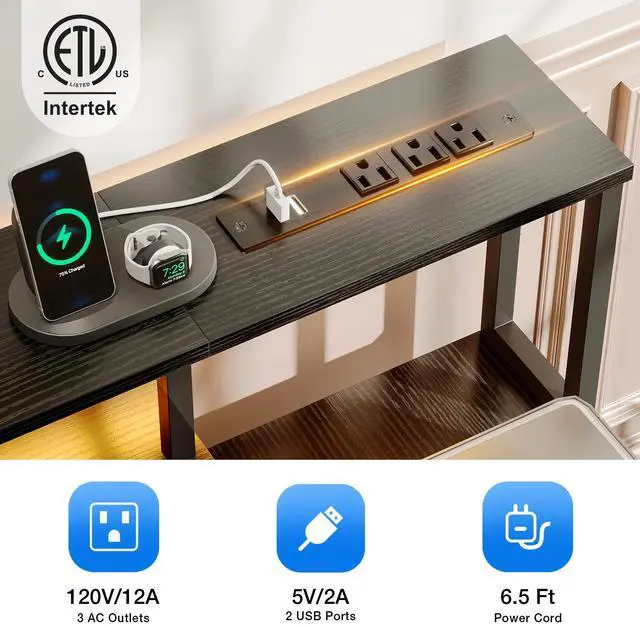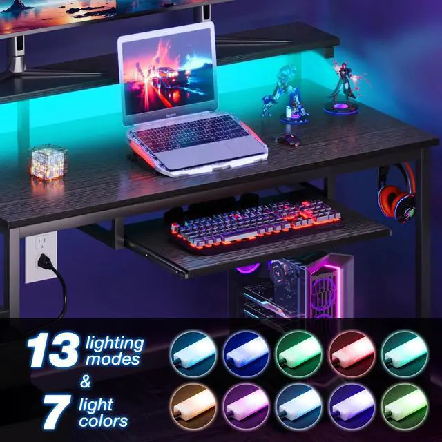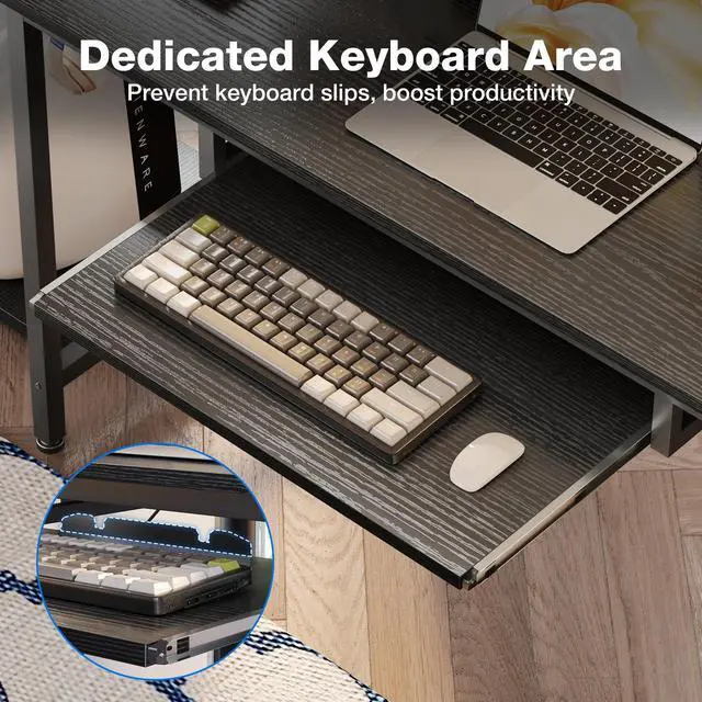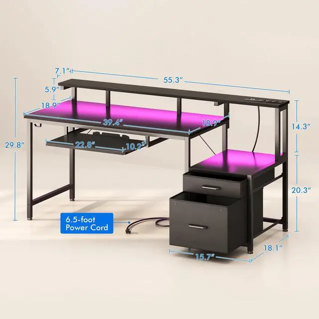 USB Charging Ports & Power Outlets - Perfect for storage and high enough for your computerPull-out Keyboard Tray - Suits for full size 108 Keys keyboard or 87 Keys keyboard adding mouse. The baffle can prevent the keyboard from slipping outMultifunctional File Drawer - Keeps your office or study supplies in order and privacy. The printer fits just above the drawer55 Inch Full Size Monitot Stand - Can easily and conveniently charge your smart phone, gaming gear and Bluetooth devices