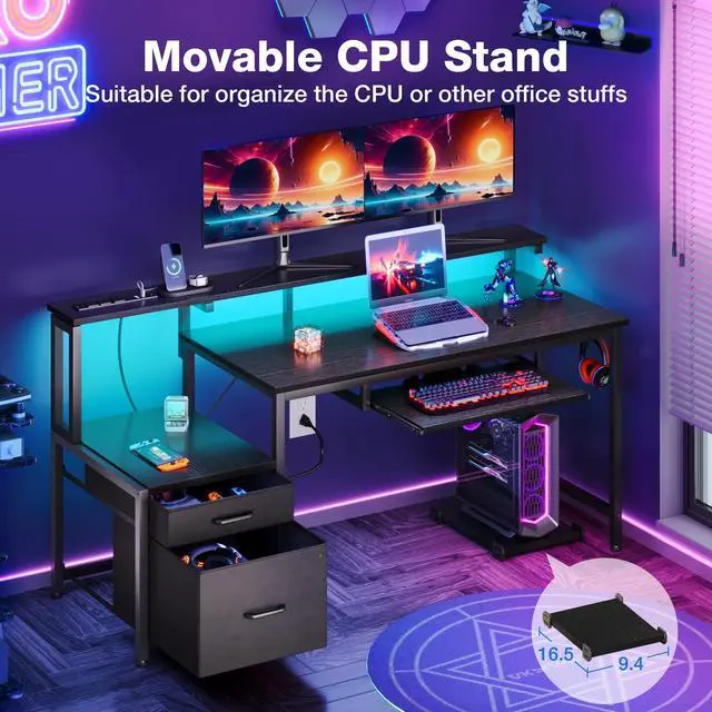 55 Inch Reversible Gaming Desk with Power Outlets and LED Light, Office Desk with File Cabinet & Drawer, Computer Desk with Keyboard Tray and Full Monitor Riser and PC Stand, Study Table, Black
