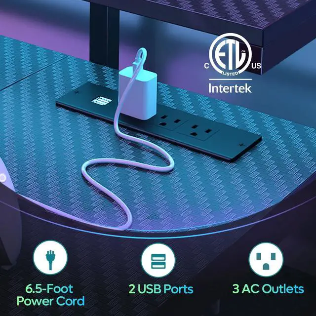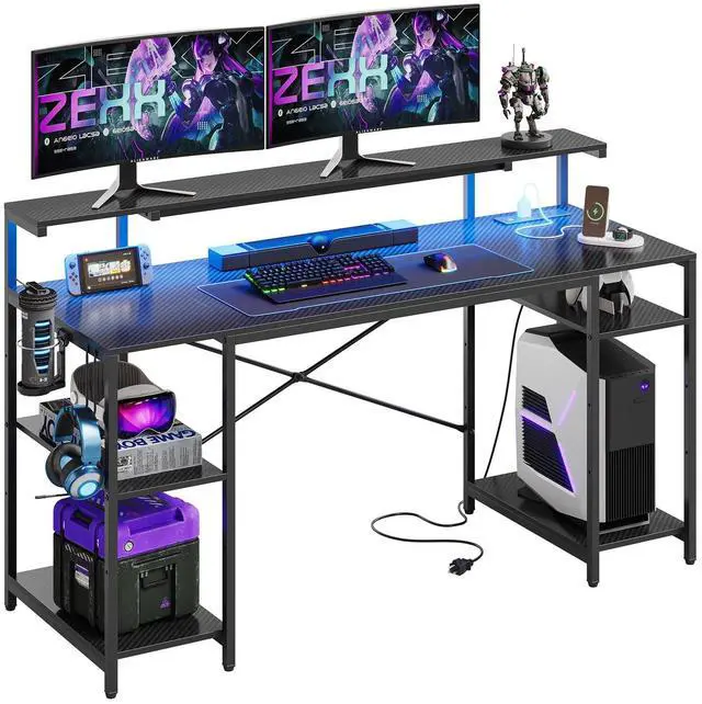 Bestier 55" Gaming Desk with LED Light & Monitor Stand Computer Desk Corner Desk for Home Office Black Carbon Fiber 3 Outlets 2 USBs