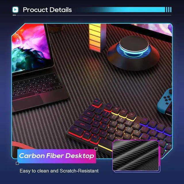1. Large surface: This gaming desk workstation offers huge space for PCS, gaming keyboards, gaming monitors, and other gaming devices. Smooth carbon fiber textured surface for a comfortable gaming experience.