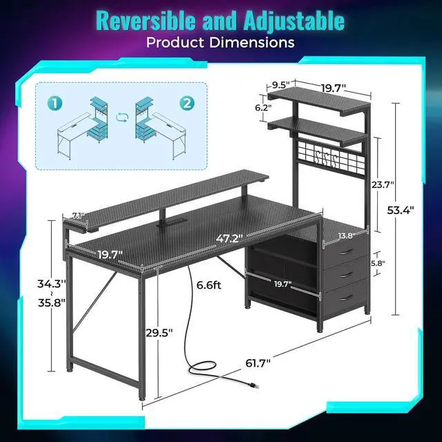 Bobobigo 61.7" Gaming Desk with LED Lights & Outlets, Computer Desk with 3 Fabric Drawers, PC Desk with PC Case Stand & Movable Storage Shelves, Monitor Stand, Reversible, Carbon Fiber Black