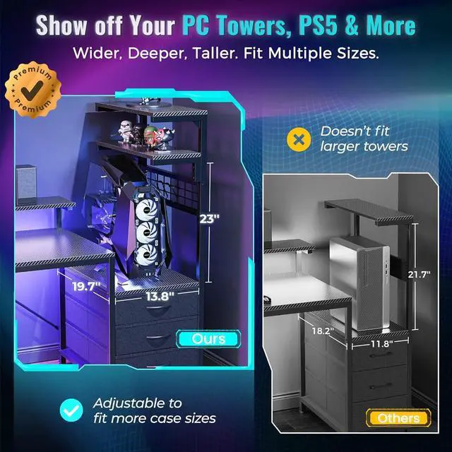 CPU Stand for Full-View PC Case & Movable ShelfThis gaming desk with storage features a recessed PC case stand that elevates your glass-panel PC case, showcasing every RGB fan, custom loop, and glow. Paired with the desks LED system, it creates a unified light show for a true gaming center. 1 top shelf can be removed and installed as a side desktop extension, giving you more room