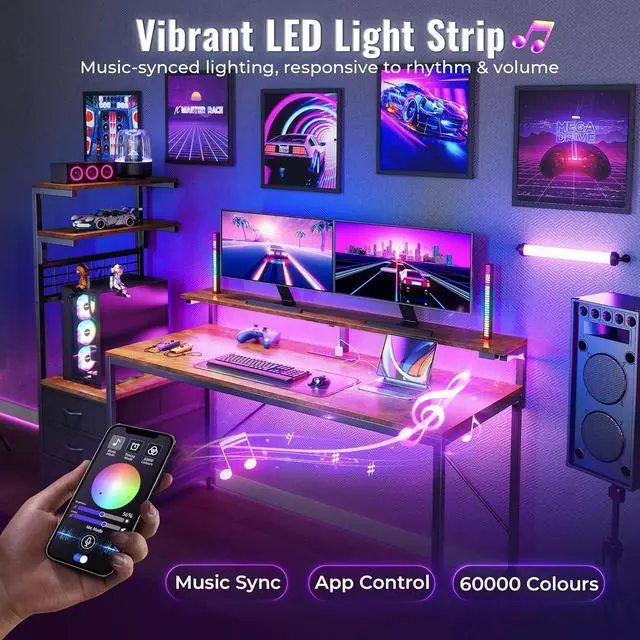 Larger Gamer Desk with LED LightsUse the built-in RGB LED lights to shift between work and play. Go full custom with the mobile app: explore 60,000+ colors, set timers, or sync lights with your voice or music beats. 12-color fade, 8 flashing modes, infinitely adjustable brightness and speed allow you to create any mood you like. This pc gaming desk is not just a desk, it's a vibe