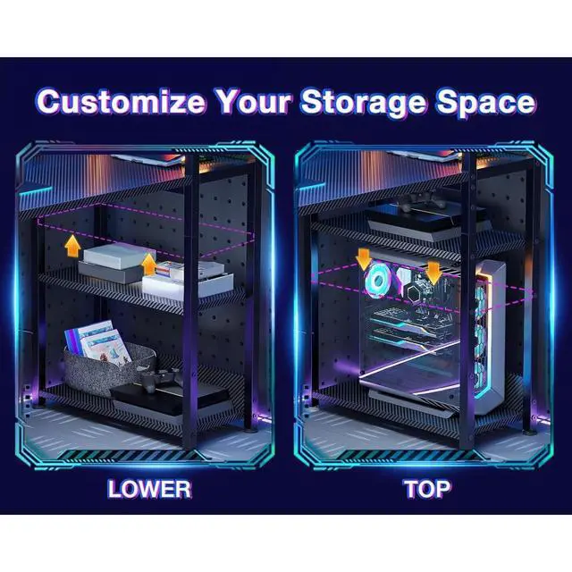 Gaming Desk with Colorful LED LightsThis gaming table features LED strip that contains 10 static colors, 6 brightness grades, 10 dynamic modes and memory function with switching controls. Adjusting to the proper lighting can reduce eye strain, improve focus, and create a comfortable workspace/gaming space.