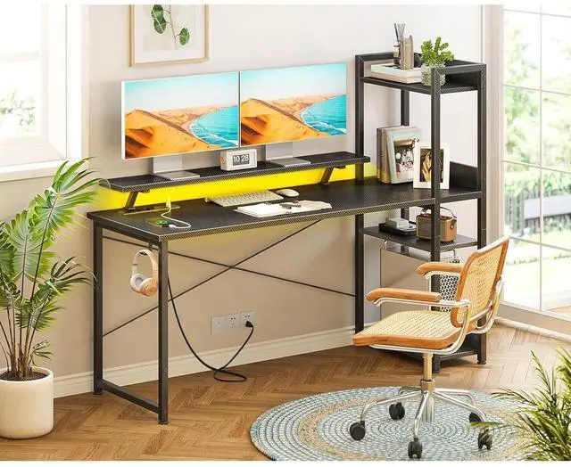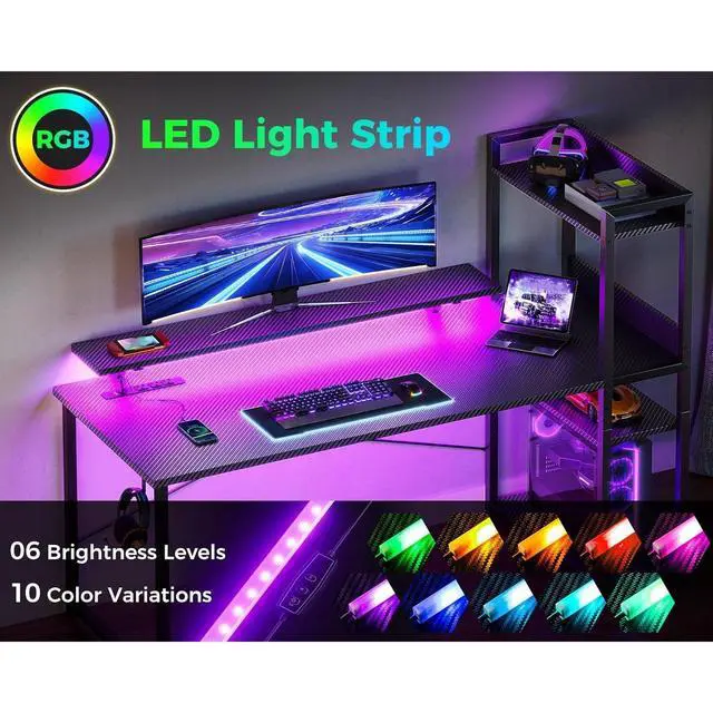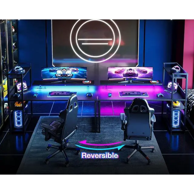 Bobobigo Reversible 55 Inch Gaming Desk with USB Charging Port and LED Lights, Computer Desk with Storage Shelves and Monitor Stand, Study Table for Home Office, Morden Desk for Bedroom, Carbon Fiber