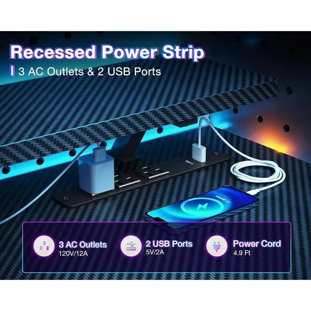 Computer desk with Power OutletsThe office desk is equipped with 3 power outlets and 2 USB charging ports for your electronic devices, you can easily and conveniently charge your smart phone, gaming gear or Bluetooth devices when play computer games or work from home. A versatile hook provides additional storage space for your convenience.