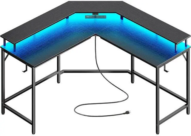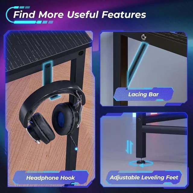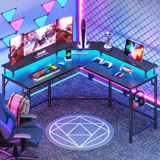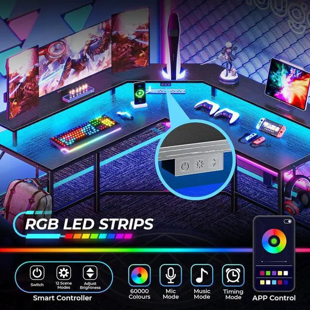 Gaming Desk with LED Lights: 20 colors, 22 modes, 5 adjustable brightness levels, and 10 flicker frequencies on this l shaped desk allow you to create a dynamic gaming ambiance. The carbon fiber desktop brings a tactile surface, further enhancing your gaming experience.