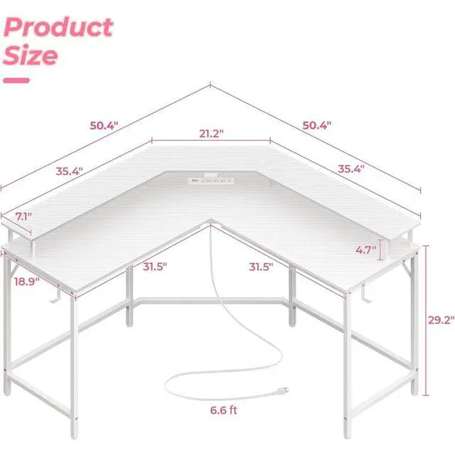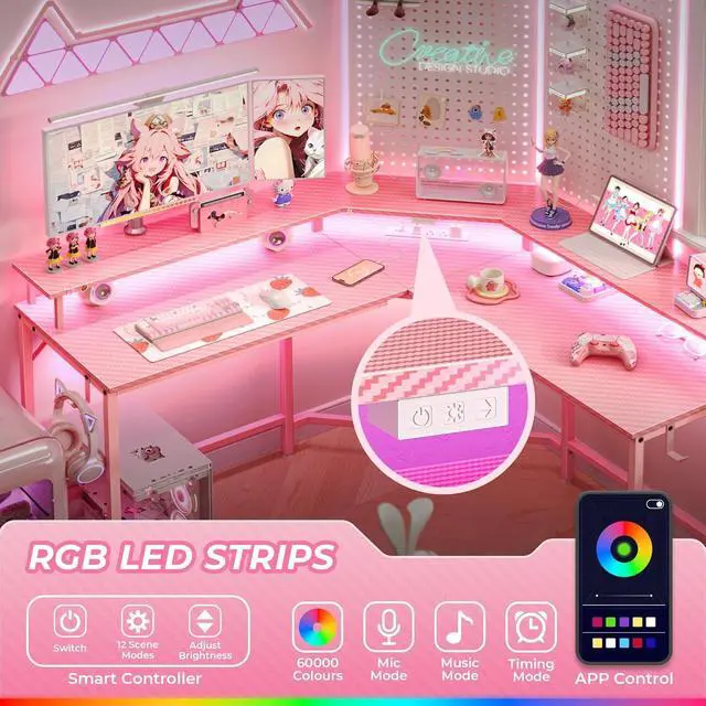 Gaming Desk with LED Lights: 2 lighting control methods - smart controller on LED light strip and App on smartphones, this l shaped desk allow you to create a dynamic gaming ambiance easily. The carbon fiber desktop brings a tactile surface, further enhancing your gaming experience