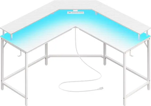 Bobobigo L Shaped Gaming Desk with Power Outlets & LED Lights, Computer Desk with Monitor Shelves, Carbon Fiber Surface, Home Office Desk, Corner Gaming Desk with Hooks, Carbon Fiber White