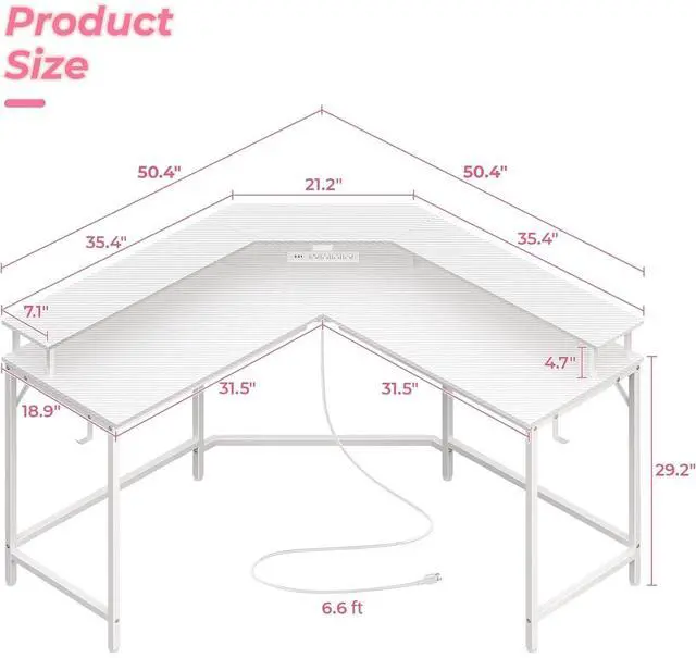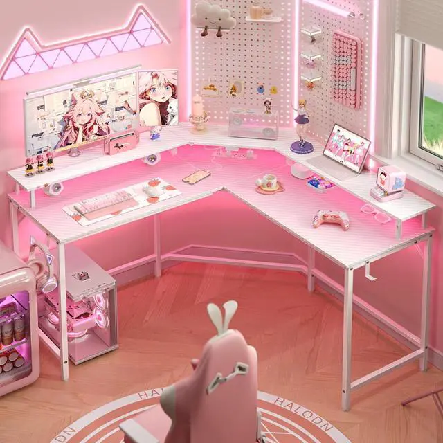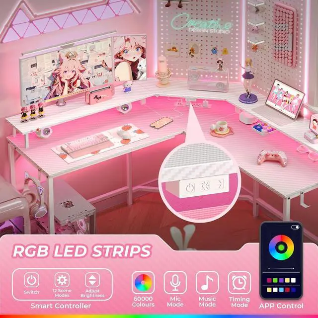 Gaming Desk with LED Lights: 2 lighting control methods - smart controller on LED light strip and App on smartphones, this l shaped desk allow you to create a dynamic gaming ambiance easily. The carbon fiber desktop brings a tactile surface, further enhancing your gaming experience