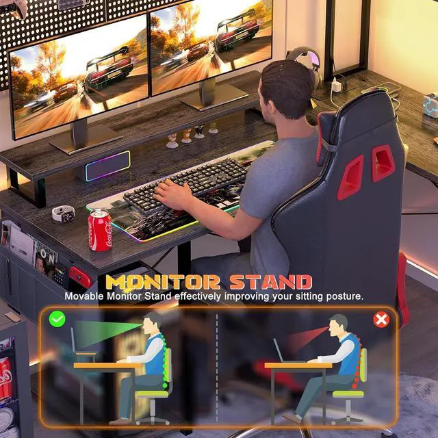 GAMER DESK WITH POWER OUTLETOur Small Gaming l shaped desk features 3 AC outlets + 2 USB charging ports to provide power for up to 5 devices simultaneously. Easily charge your computer, ps4, smart phone, power bank or gaming gear. don't need to put additional power strips on the tabletop, providing great convenience for gaming or home office.