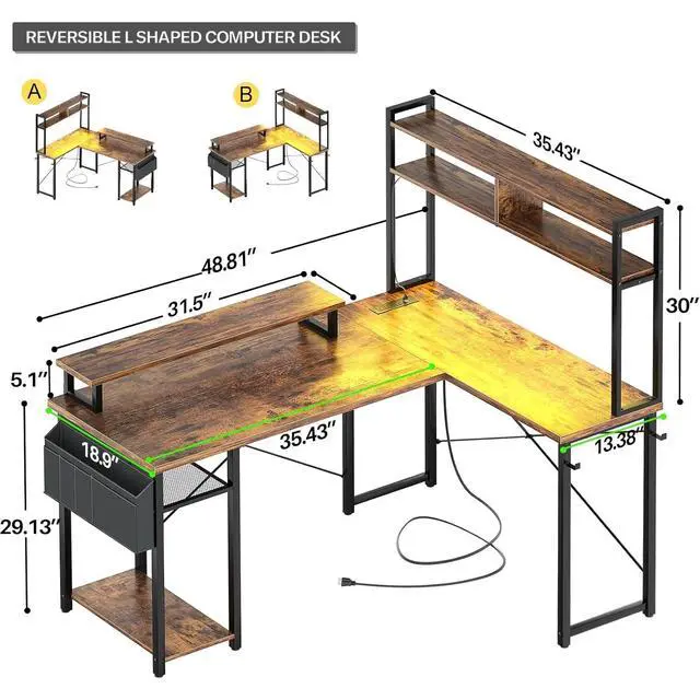 ENSURE GOOD SITTING POSTUREThis corner desk with hutch offers a moveable monitor stand that elevates your line of sight, keeps you maintaining proper sitting posture and protect your cervical and spinal health, it could also be placed at the storage side to create a storage shelf.Dimension:18.9"D x 48.82"W x 59.13"H