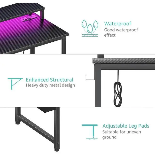 Gaming Desk With LED Lights: Equipped with a built-in RGB LED lights strips, the led gaming desk provides 7 adjustable colors, 4 dynamic modes, 16 static types, create different lights ambiance which provide different work or game scenarios