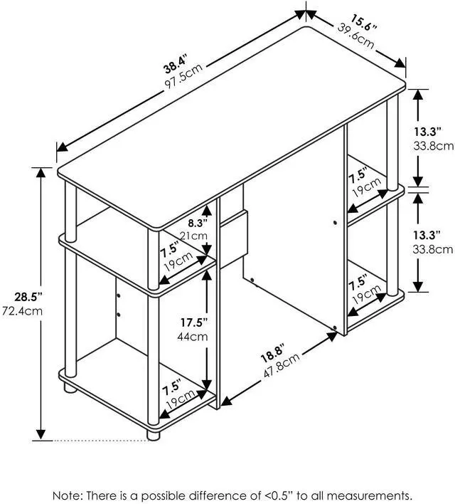 WEIGHT CAPACITY: This office desk supports up to 25 lb (11.3 kg) on the tabletop; each upper side shelf supports 5 lb (2.3 kg); each lower side shelf supports 10 lb (4.5 kg); total static load 55 lb (24.9 kg).