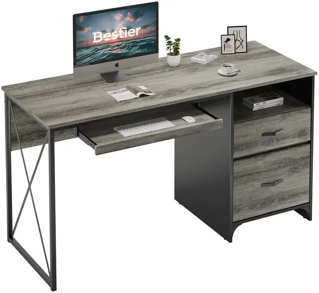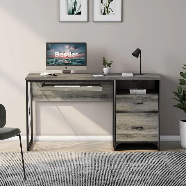 Bestier Office Desk with Drawers, 55 inch Industrial Computer Desk with Storage, Wood Teacher Desk with Keyboard Tray & File Drawer for Home Office, Dark Gray Oak