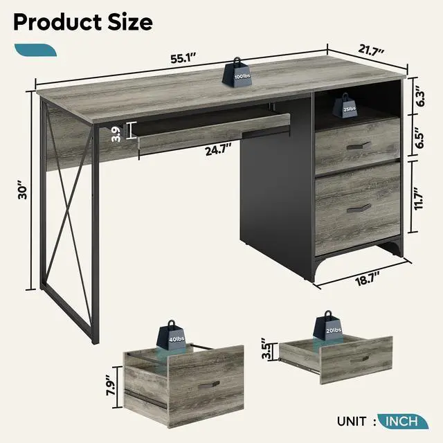 INDUSTRIAL STYLE DESIGN - Covered in gray oak, the industrial desk fits perfectly with home office furniture and floor, creating an efficient and comfortable working atmosphere.