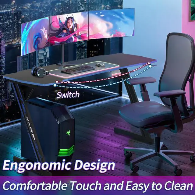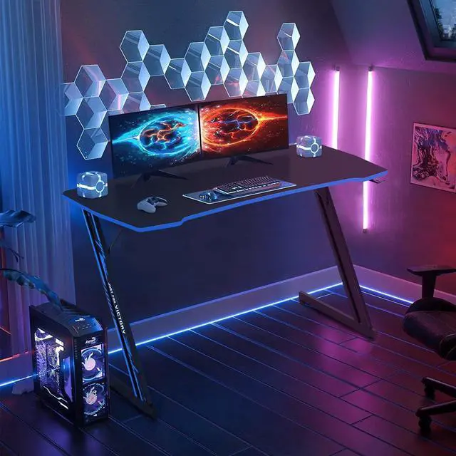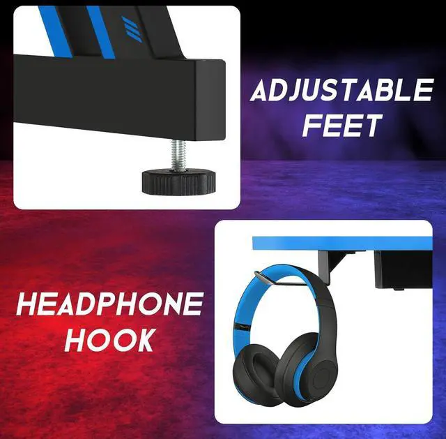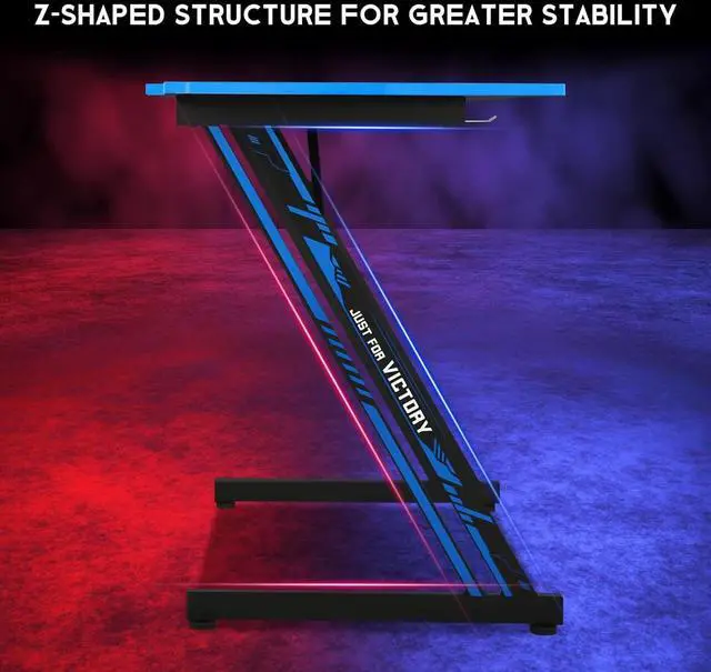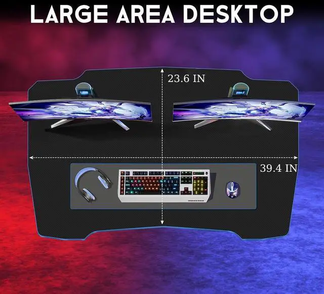 Spacious Computer Desktop:The blue gaming computer desk with headphone hook, The dimensions of this Z shaped gaming computer desktop are 39.4 "W x 23.6 "D, enough for your monitor, mouse and keyboard and other gaming devices, and more. For game lovers bring a better experience for each gamer.