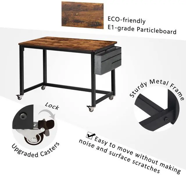MINIMALIST DESIGN: Simple and modern AHB rolling computer desk features industrial rustic brown tabletop and metal frame. It is suitable for most interior decoration styles, whether it's in the living room, study room,office and schoolroom.