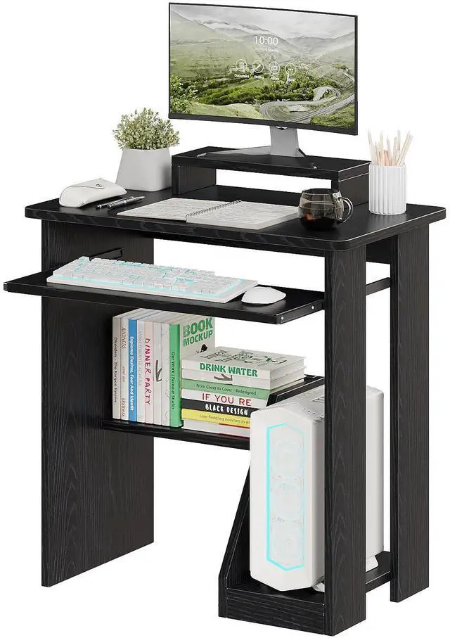 All-in-One Storage for Small Spaces This small computer desk (ideal as a small computer desk for small spaces) has shelves, a keyboard tray, a monitor stand, and a CPU holderchecking all boxes for a computer desk with shelves, desk with keyboard tray, and small desk with storage. Made of quality MDF and metal, it comes in black, white, pink to fit any decor.