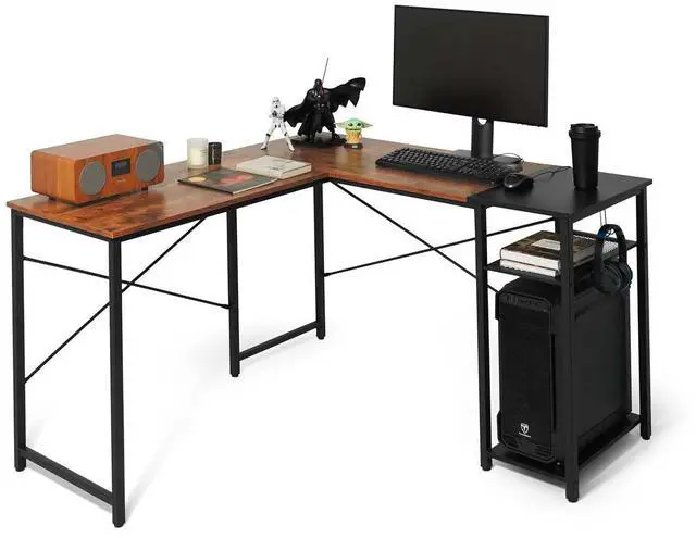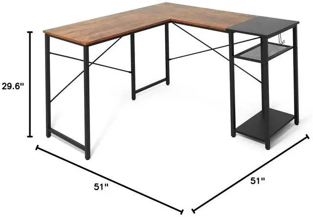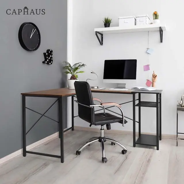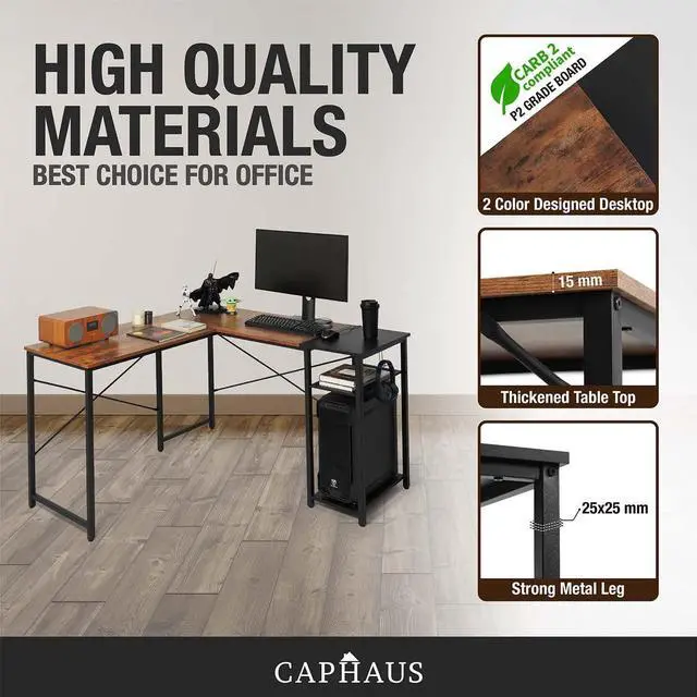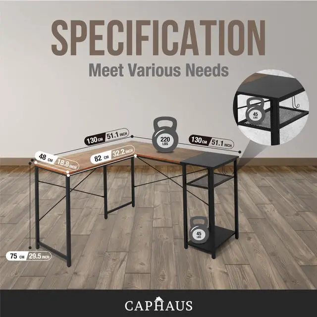 Space-Saving 51-inch L-Shaped Corner Desk: This CAPHAUS L-shaped desk maximizes corner efficiency for small spaces, creating an immersive workspace for home office, gaming, and study. The industrial steel frame and P2 wooden board ensure rugged durability, while the L-layout provides ample surface area for multi-monitor setups (ideal for dual monitors) and gaming rigs. Two adjustable integrated shelves offer quick-access storage, and the dedicated headphone hook keeps gaming/office gear organized