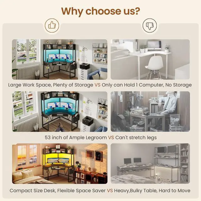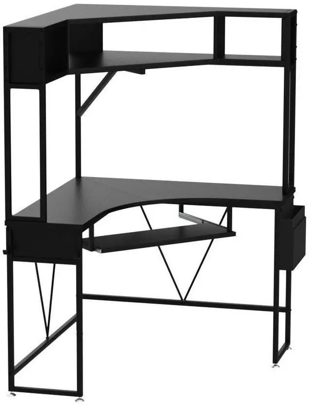 Ample Storage SpaceWhere should things be kept when you are studying or working? Corner desk with 2-tier storage shelves, keyboard tray, storage bag and headphone hook can help you quickly and efficiently classify storage. 2-tier storage shelves can place printer, books, photo albums, documents, storage baskets etc. corner desk with storage bag is easily to keep your desk tidy. Headphone hook is convenient to put earphone or backpack. Abundant storage space can meet all your needs !