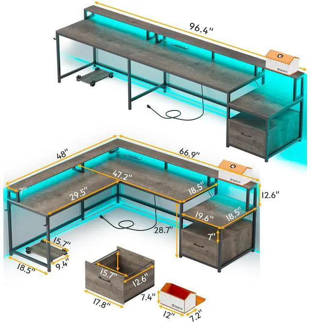 Convertible Desk67 inch corner desk or 98.4 inch two person desk: The L shaped computer desk could hold three desktop computers and one notebook computer. The desktop size is 47"L*18.5"W and 48"L*18.5"W. Or 96.4 inch two person desk can hold two-person studying or writing no interference. The simple design and multi-function storage to meet all needs. An ideal desk for small rooms or limited spaces to create excellent home office space.