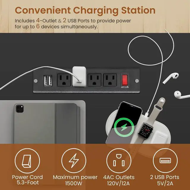 MultifunctionalHome office desks equipped with 4 AC outlets and 2 PowerIQ-enabled USB charging ports to provide power for up to 6 devices simultaneously. Also includes an on-off switch, thanks to the on-off switch, one-button power off to ensure safe electricity use, which strengthens security. The monitor stand can easily raise the monitor to a suitable height, reducing the tension and pain of the back and neck. CPU shelf protects the host from moisture and dust.