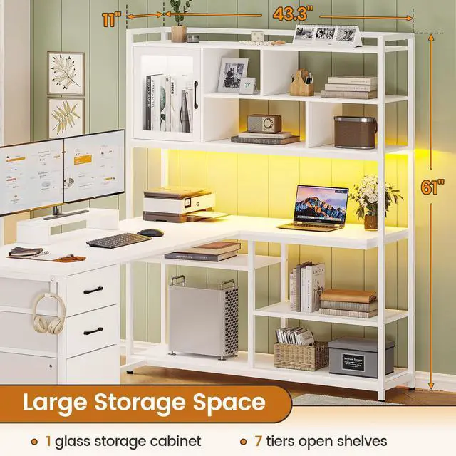 Large Storage SpaceL shaped desk with 7 tiers open shelves, 1 glass storage cabinet, This 61" tall bookshelf has 7 shelves , which offer enough space to store your daily items, books, files, printer stand, CPU stand or game figure, collect trophies, and souvenirs.