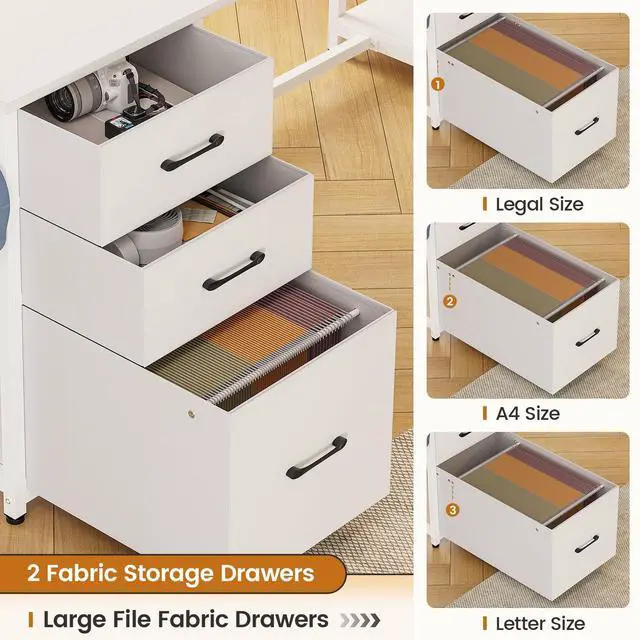 3 Large Fabric DrawersComing with a 1 fabric file drawer, 2 storage fabric drawers with powerful storage space. File cabinet can hold letter/A4/legal files. This solid constructed computer desk could hold printers, scanners, fax machines and any other office machines, keeps printer or scanner within easy reach of your desk to free up work space.
