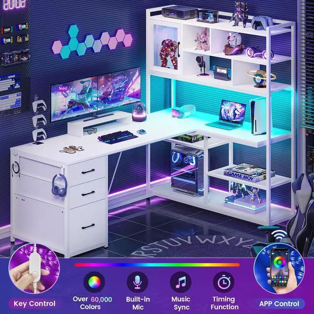 SEDETA L Shaped Computer Desk, 58'' Office Desk with 3 Drawers and Bookshelf, L Shaped Corner Desk with Storage Shelves and LED Light for Home Office, Gaming Desk, L Desk, White
