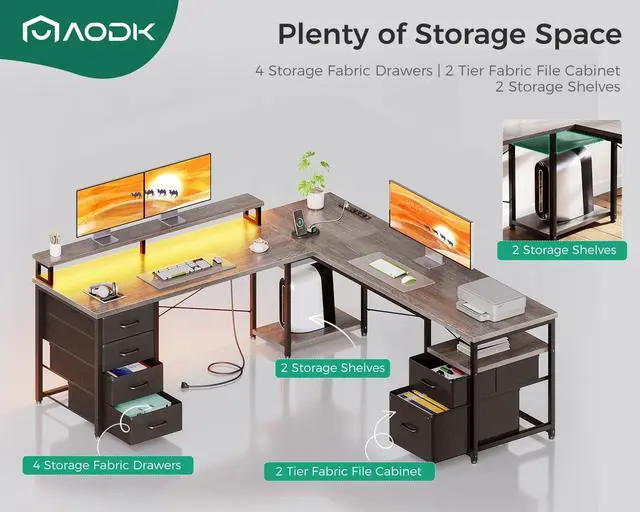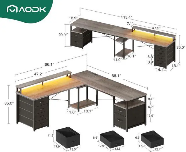 AODK 66" L Shaped Desk, 113" Computer Desk with File Cabinet & 4 Fabric Drawers, Home Office Desk with Monitor Shelf & Power Outlet, Two Person Desk or Corner Desk, Gaming Table with LED Light, Grey