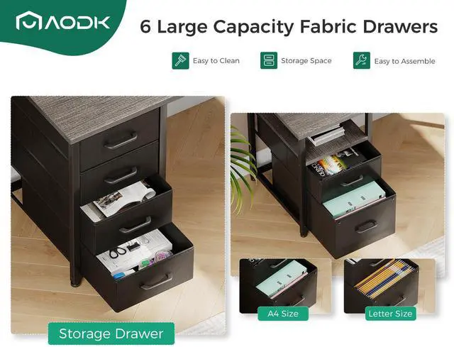 L Shaped Desk with DrawersThis home office desk includes a file cabinet and 4-tier storage fabric drawers. File cabinet has two drawers to organize letter, legal and A4 size files. The 4-tier storage fabric drawers provide spacious under-desk storage space, keep your desktop clean and tidy.