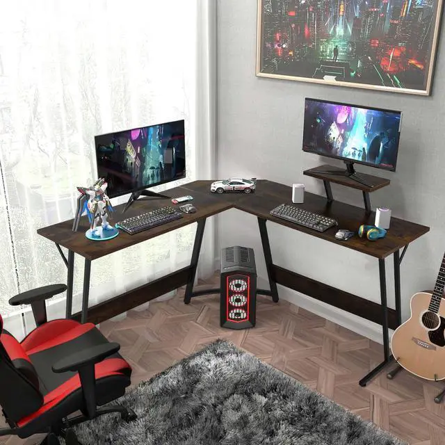L Shaped Gaming Desk Modern Computer Desk, Home Office Desks with Large Monitor Riser Stand, Sturdy PC Desk for Bedroom Minimalist Brown 50Inch