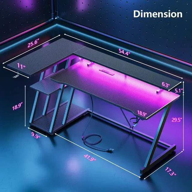 55 Inch Gaming Desk with Power Outlet & LED Lights, L Shaped Gamer Computer Table with Storage Shelves for Bedroom, Corner Home Office Desk, Carbon Fiber Black