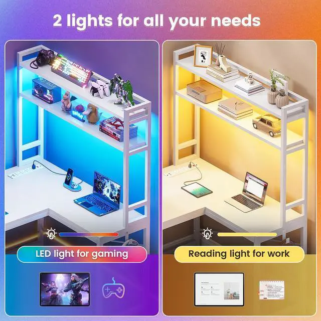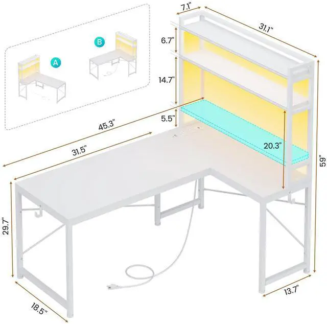 White Corner Desk The white corner desk comes with storage shelves, a power outlet, 2 kinds of light strip, and 2-iron hooks for small space. 45.3"(L)*18.5"(W) dimension can easily accommodate your laptop, books, files, and other items. An ideal corner desk for small space to create excellent home office space.