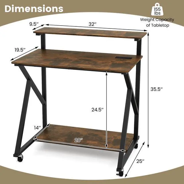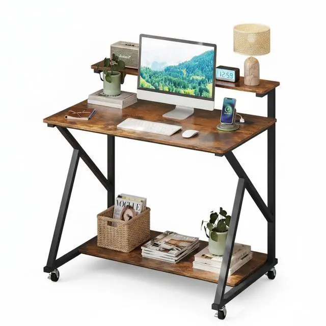 Clever Storage Solutions: The monitor stand on this rolling laptop table lifts your screen to a comfortable eye level and opens up extra desktop real estate for keyboards, notebooks, or coffee. Beneath the work surface, a bottom shelf swallows a computer tower, printer, or stack of textbooks, so your small computer desk stays clutter-free and productive.