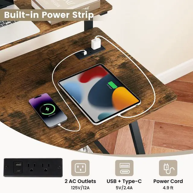 Built-in Power Strip: A built-in power hub turns this mobile computer workstation into a clutter-free command center thanks to 2 AC outlets, USB, and Type-C ports that keep every device charged. No more crawling under your compact office deskjust plug monitors, laptops, and phones directly into the desktop strip for instant power.
