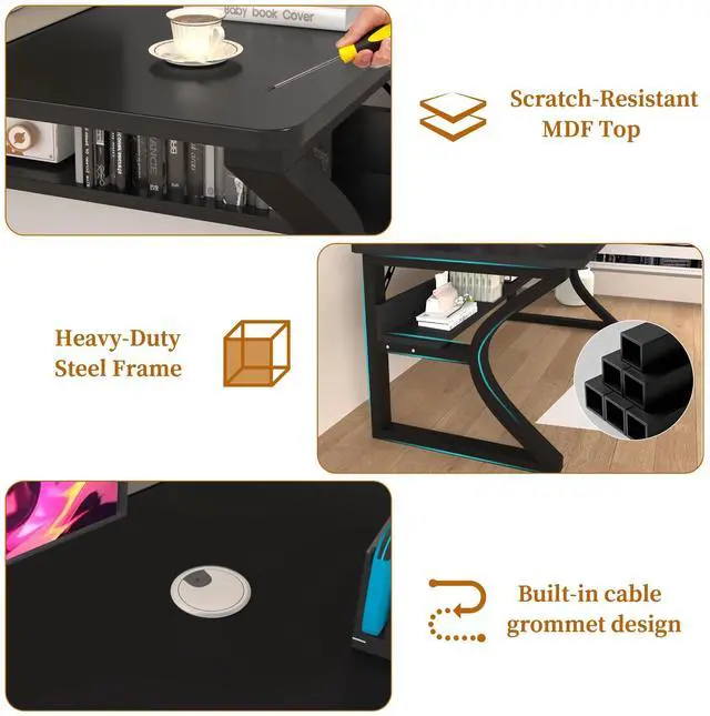 Built-In Storage Shelf & Cable Management for a Tidy WorkspaceMaximize organization with this efficient desk with storage. The added under-desk shelf provides easy access to books, supplies, or accessories, making it a highly functional desk with shelves for home office. The integrated cable management hole keeps wires neatly routed and out of sight, helping you maintain a clean and productive computer desk setup.