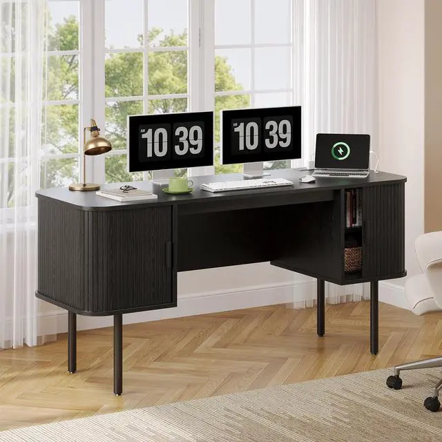 ONBRILL 63 Inch Fluted Computer Desk with Charging Station, Mid Century Executive Desk with 2 Storage Cabinets, Modern Home Office Large Desk with Metal Legs for Working, Studying, Writing, Black
