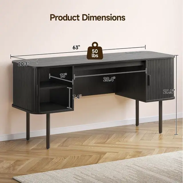Ample Storage Space: The Onbrill executive desk (63"W x 20.1"D x 29.5" H) offers generous storage to keep your essentials neatly organized, promoting a clutter-free and efficient workspace. With a balanced mix of open shelves and closed compartments, this home office desk provides both accessibility and privacy for your belongings. Ideal as a functional executive office desk, it combines spacious storage with a sleek, professional design to elevate your work environment