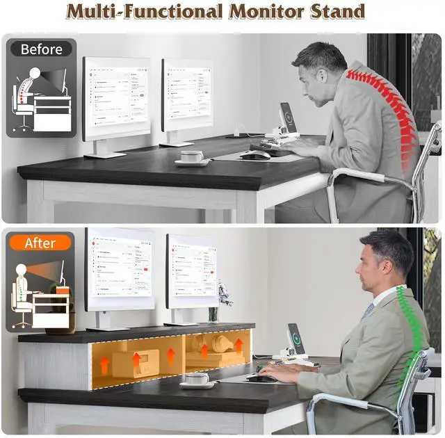 Built-in Monitor Stand: L shaped computer desk for bedroom features a full monitor stand accommodate two monitors or laptops, built-in LED lighting create strong gaming ambiance.