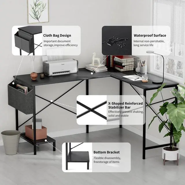 L Shaped Desk Gaming Computer 50 Inch Reversible Corner Table PC Work Table for Writing Study Student with Wood Tabletop Metal Frame CPU Stand Side Bag for Home Office Small Place