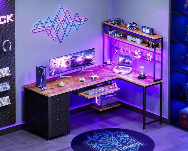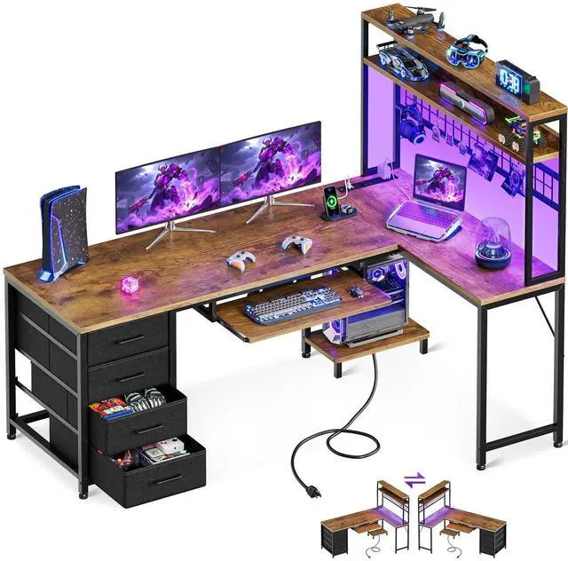 AODK 59 Inch L Shaped Desk with 4 Drawers, Gaming Desk with Led Lights & Power Outlets, Computer Desk with Pegboard, Reverisble Home Office Desk with Storage Shelves & CPU Stand, Vintage