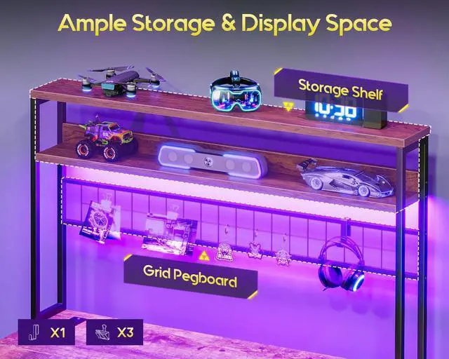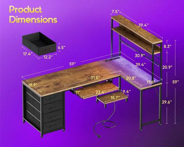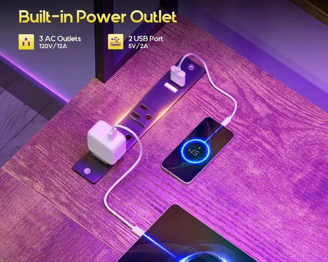 Built-in Power Outlets & LED LightThis office desk with drawers includes a power outlets with 3AC outlets and 2 USB ports for easy charging for your electronic devices. Adjustable LED light strip offers 10 colors and modes via a handy remote. Ideal for creating the perfect ambiance for work or relaxation