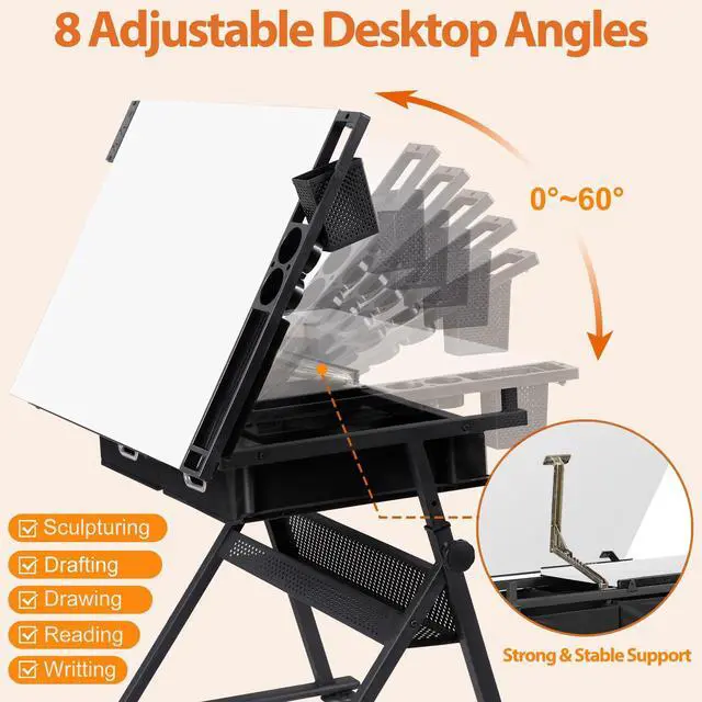 This adjustable tabletop and height drawing desk is made of high quality MDF board with PVC, durable powder coated steel frame and non-woven drawers. The sheet stopper on lip effective prevent sheets slipping
